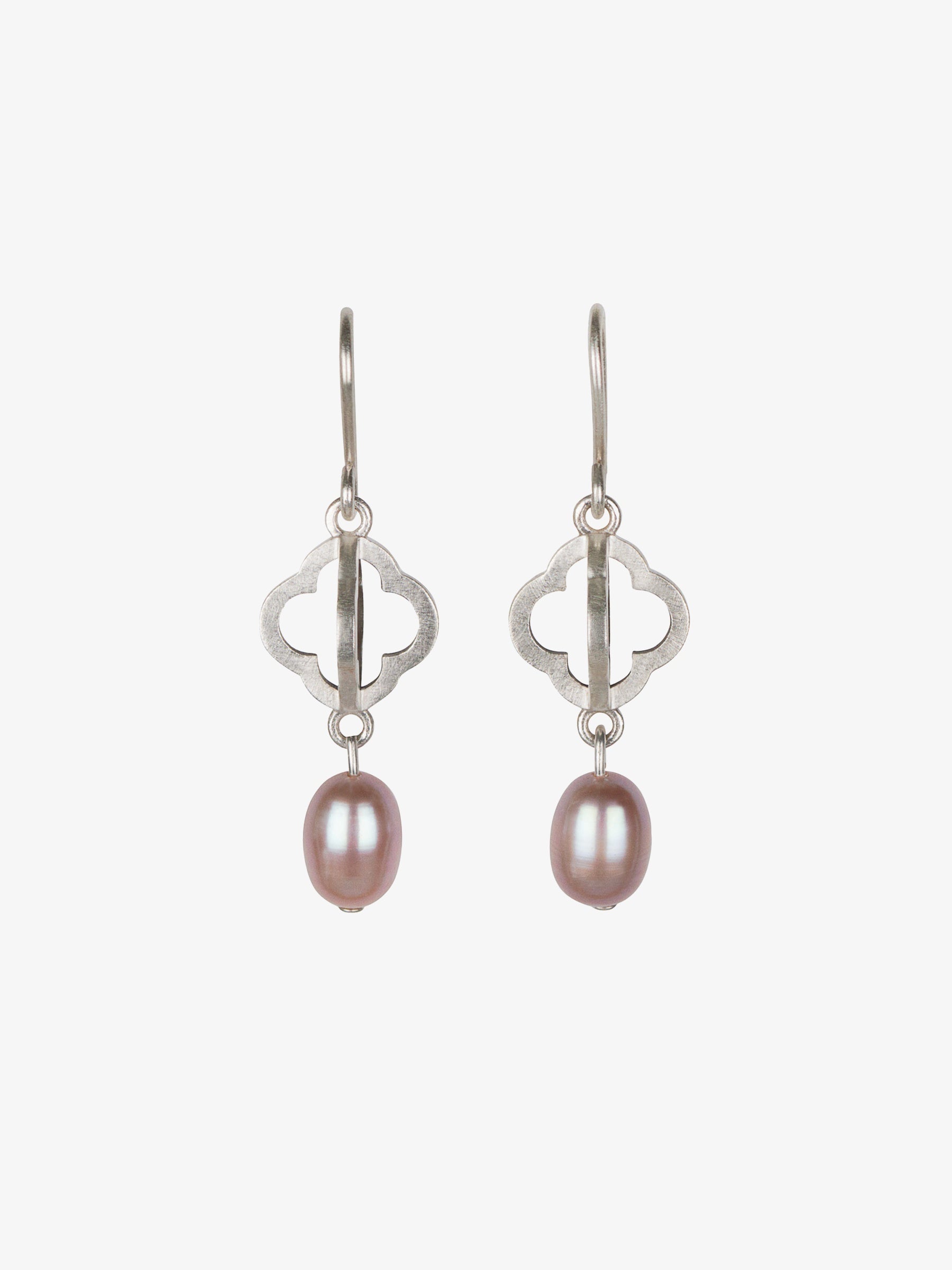 Earrings by Kate Alterio, made with satin sterling silver and natural lavender pearl.