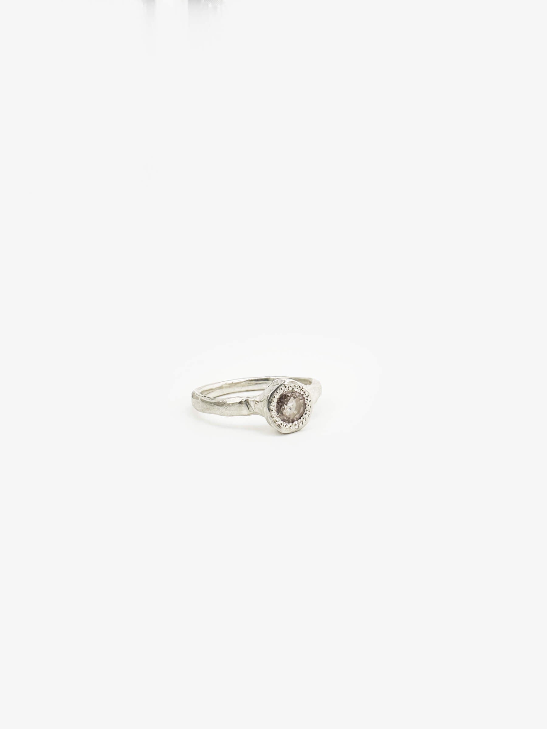 This ring features an ethically sourced 5mm round-cut light peach zircon in the centre. Sterling silver, size N1/2