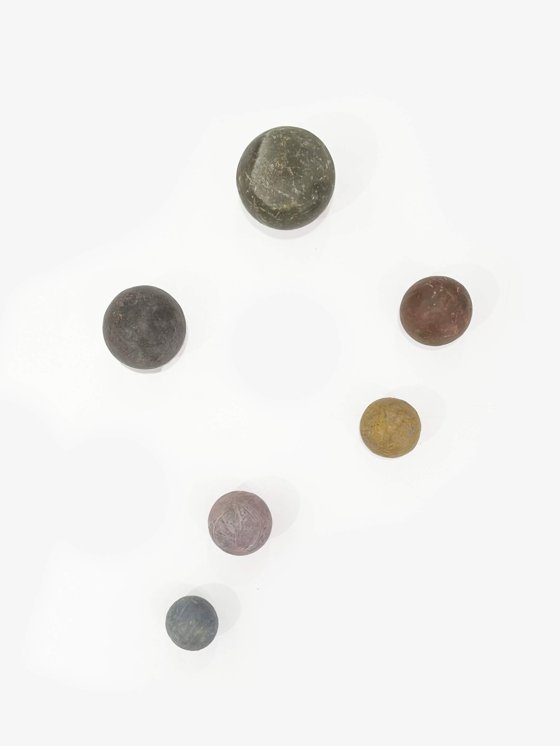 Set of 6 Hikaru Dorodangoes. Unfired clay and mud, size varies 45mm dia to 85mm dia. This artwork is designed to hang on a wall.