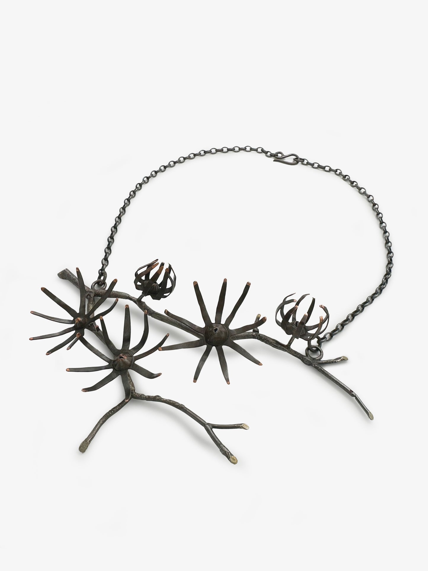 Hand fabricated neckpiece by Carmen Burgi. Made with sterling silver, copper, 18k gold solder and synthetic ruby